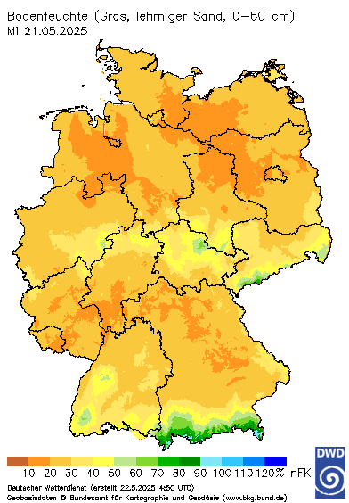 In Berlin rief zuletzt das Pflanzenschutzamt die Bevölkerung auf, junge Straßenbäume, die noch nicht so tief wurzeln, mit Wasser zu versorgen. Die Bodenfeuchte, ausgedrückt durch die nutzbare Feldkapazität (%nFK), ist seit Beginn der zweiten Maidekade unter einen Wert gesunken, ab dem eine Wassergabe notwendig wäre, um die Pflanze vor Wasserstress zu bewahren. Nach kurzzeitigem Anstieg in den Grenzbereich zwischen ausreichender und ungenügender Wasserversorgung nach wenigen Liter Niederschlag pro Quadratmeter in Berlin am Ende der zweiten Maidekade weist die Prognose schon wieder einen deutlichen Abwärtstrend auf, wobei dieser in allen Tiefen zu finden ist.