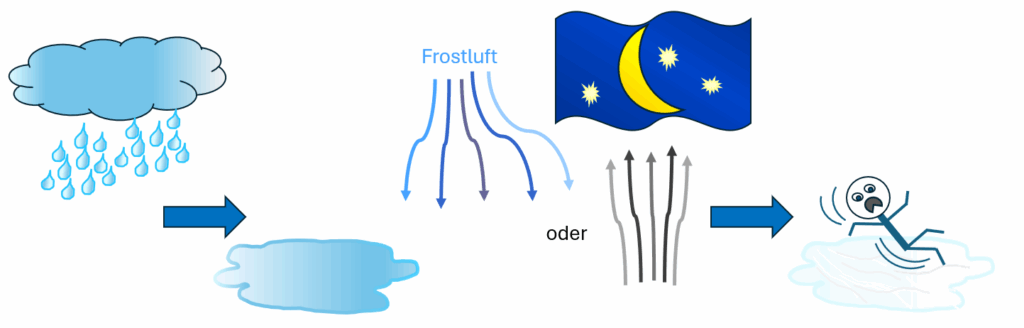 Die Abkühlung unter den Gefrierpunkt kann durch Kaltluftadvektion oder nächtliche Ausstrahlung geschehen.