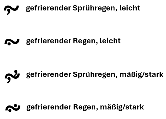In beiden Fällen spricht man auch von Blitzeis. Gekennzeichnet wird das Phänomen „gefrierender Regen“ oder „gefrierender Sprühregen“ in Wetterkarten durch die Symbole: