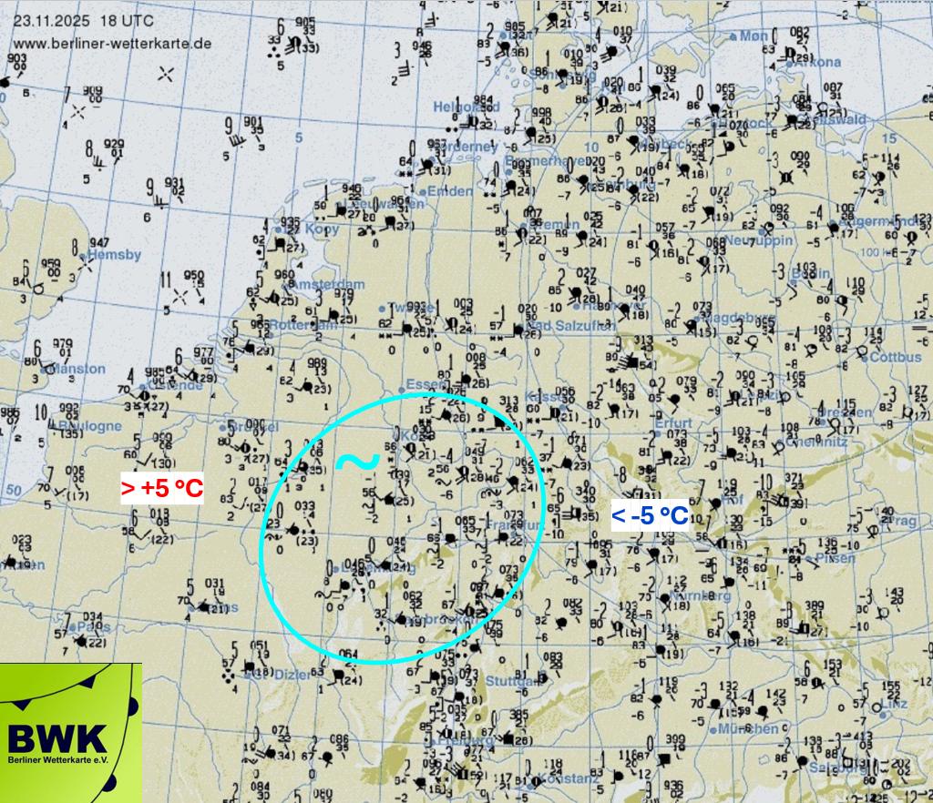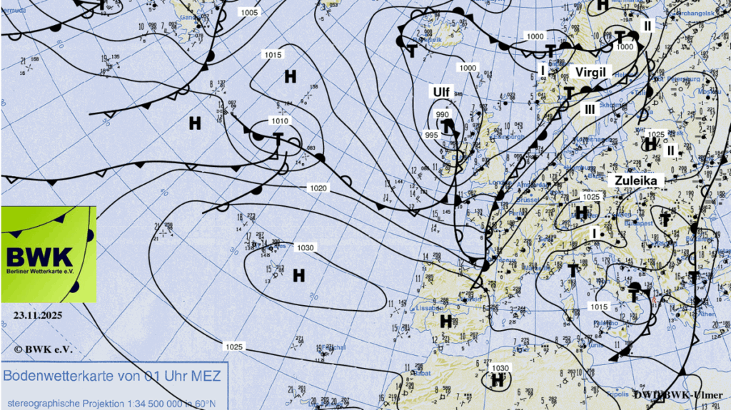 Im Verlauf des 23.11.2025 erreichte Deutschland ein Ausläufer des Tiefdruckgebietes „Virgil“, später auch die Warmfront des Tiefdruckgebietes „Ulf“ von Westen her.