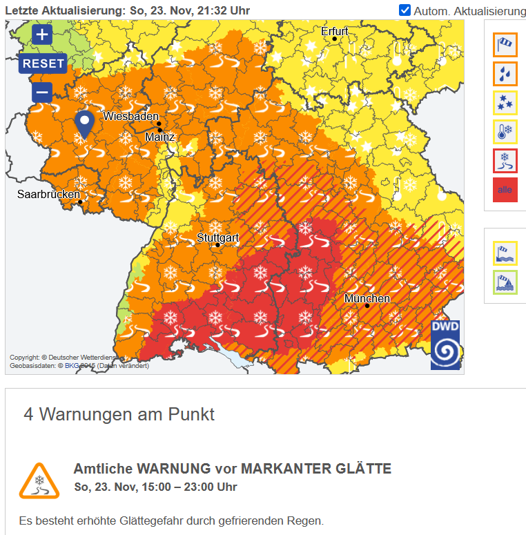 Mit dem Vordringen der Warmluft auf der Vorderseite des Tiefdruckgebietes „Ulf“ verlagert sich die Zone mit gefrierendem Regen weiter nach Osten, entsprechende Warnungen des Deutschen Wetterdienstes zeigen die betroffenen Gebiete.