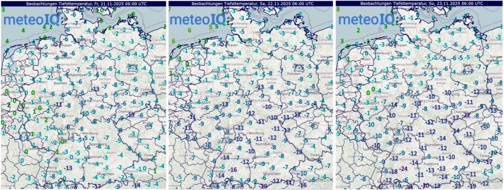 In den vergangenen Tagen hat sich über Deutschland Kaltluft etabliert. Nächtliche Tiefstwerte der Temperatur im leichten (< 0 °C bis -5°C) bis mäßigen (< -5 °C bis -10 °C), z.T. sogar starken (< 10 °C bis -15 °C) Frostbereich traten bei meist klarem Himmel im Bereich des Hochdruckgebietes „Zuleika“ auf.