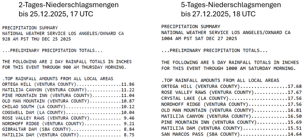 Verbreitet fielen an Heiligabend über 100 l/m2 Niederschlag in 24 Stunden, vor allem höher gelegene Regionen im Ventura County meldeten mehr als 250 l/m2 in 48 Stunden (Ortega Hill 11,86 inch, d.h. mehr als 300 mm). Nach 120 Stunden lag der Spitzenwert bei knapp 450 l/m2 (17,68 inch).