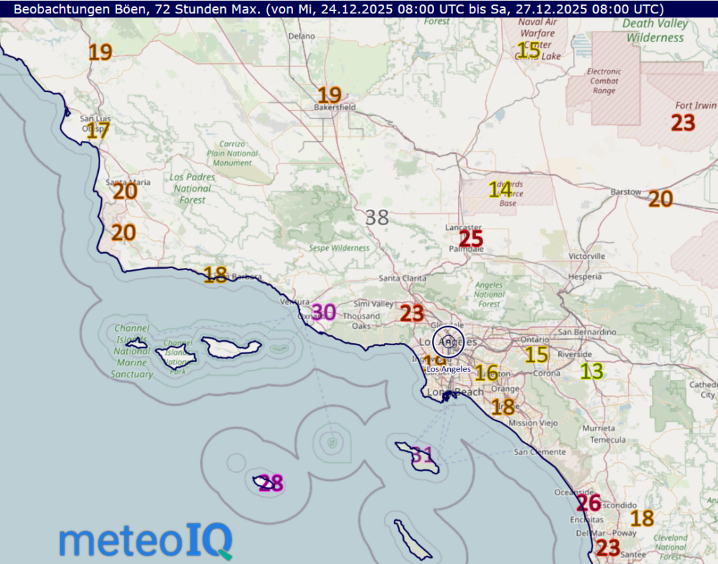 Am Camarillo Airport wurden am 24.12.2025 gegen 14:30 UTC Windböen mit 29,8 m/s registriert, das entspricht Windstärke 11 Beaufort.
