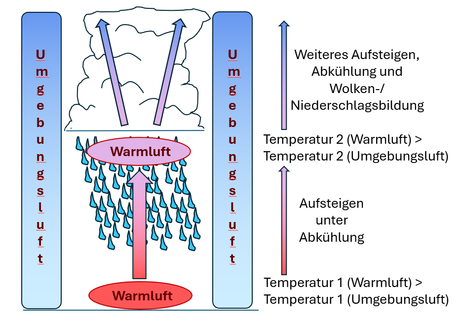 stark vereinfachte Darstellung von Konvektion mit hochreichender Wolkenbildung und heftigen Schauern