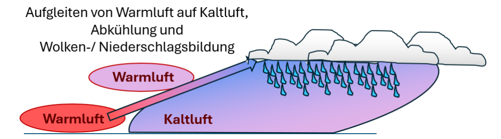 stark vereinfachte Darstellung von Advektion mit Bildung einer ausgedehnten Wolkenschicht und flächenhaften Niederschlags