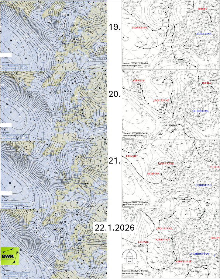 Höhenwetterkarte für 500 hPa und Bodenanalyse, 19. bis 22.01.2026, 00 UTC