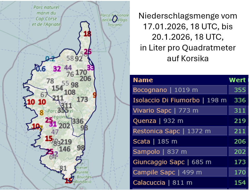 Niederschlagsmenge auf Korsika vom 17.01.2026, 18 UTC, bis 20.01.2026, 18 UTC,