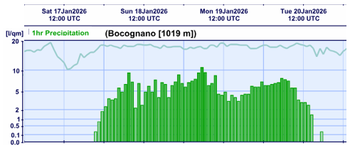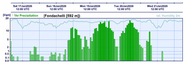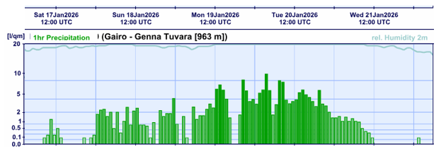 Niederschlagsverlauf an der Station Gairo – Genna Tuvara auf Sardinien, 17. bis 21.01.2026
