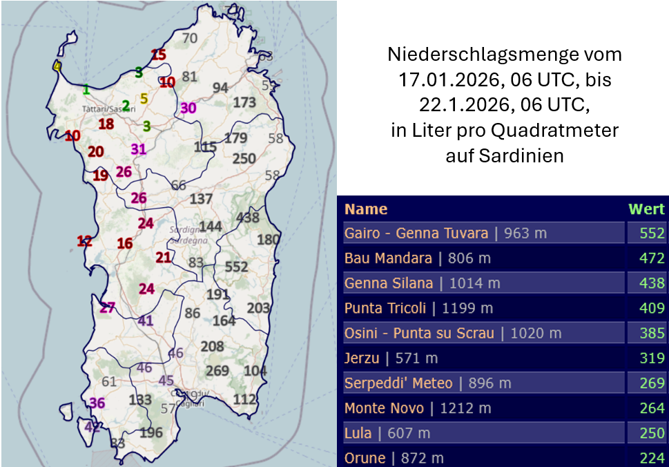 Niederschlagsmenge auf Sardinien vom 17.01.2026, 06 UTC, bis 22.01.2026, 06 UTC,