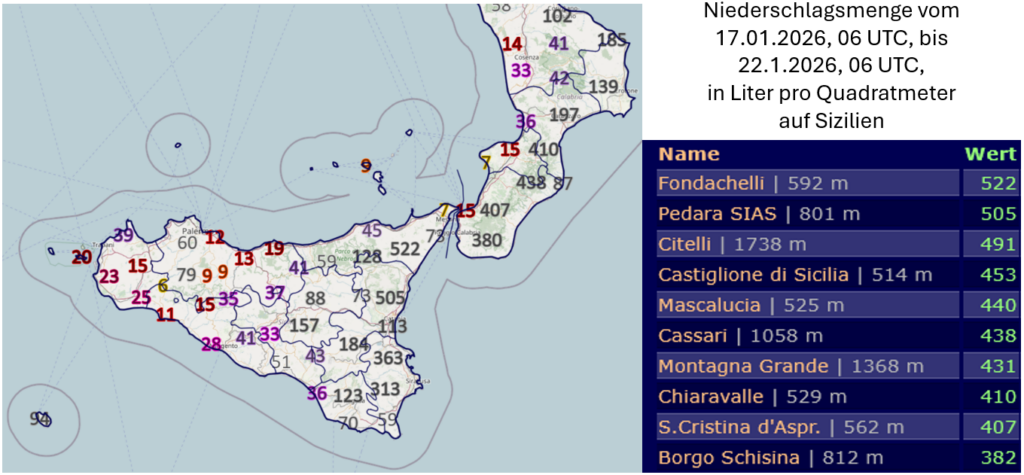 Niederschlagsmenge auf Sizilien vom 17.01.2026, 06 UTC, bis 22.01.2026, 06 UTC,