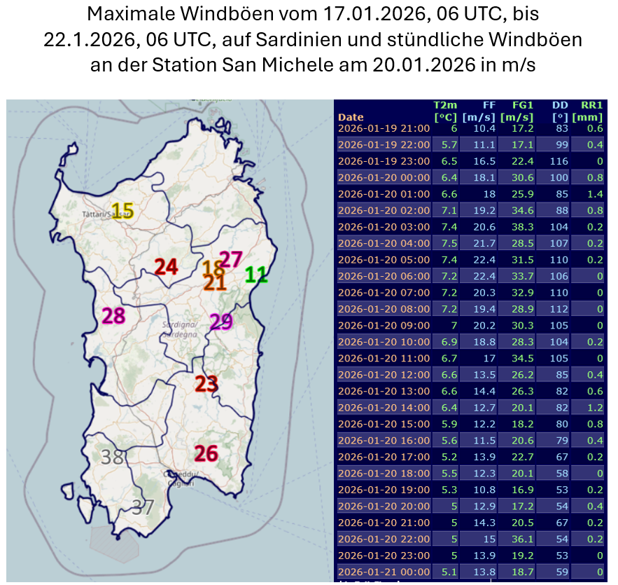 Nicht nur der anhaltende, ergiebige Niederschlag sorgte für Schäden, hinzu kamen Windböen bis Orkanstärke, wie auf Sardinien, wo zu Tagesbeginn des 20.01.2026 38,3 m/s an der Station San Michele (902 m) registriert wurden.
